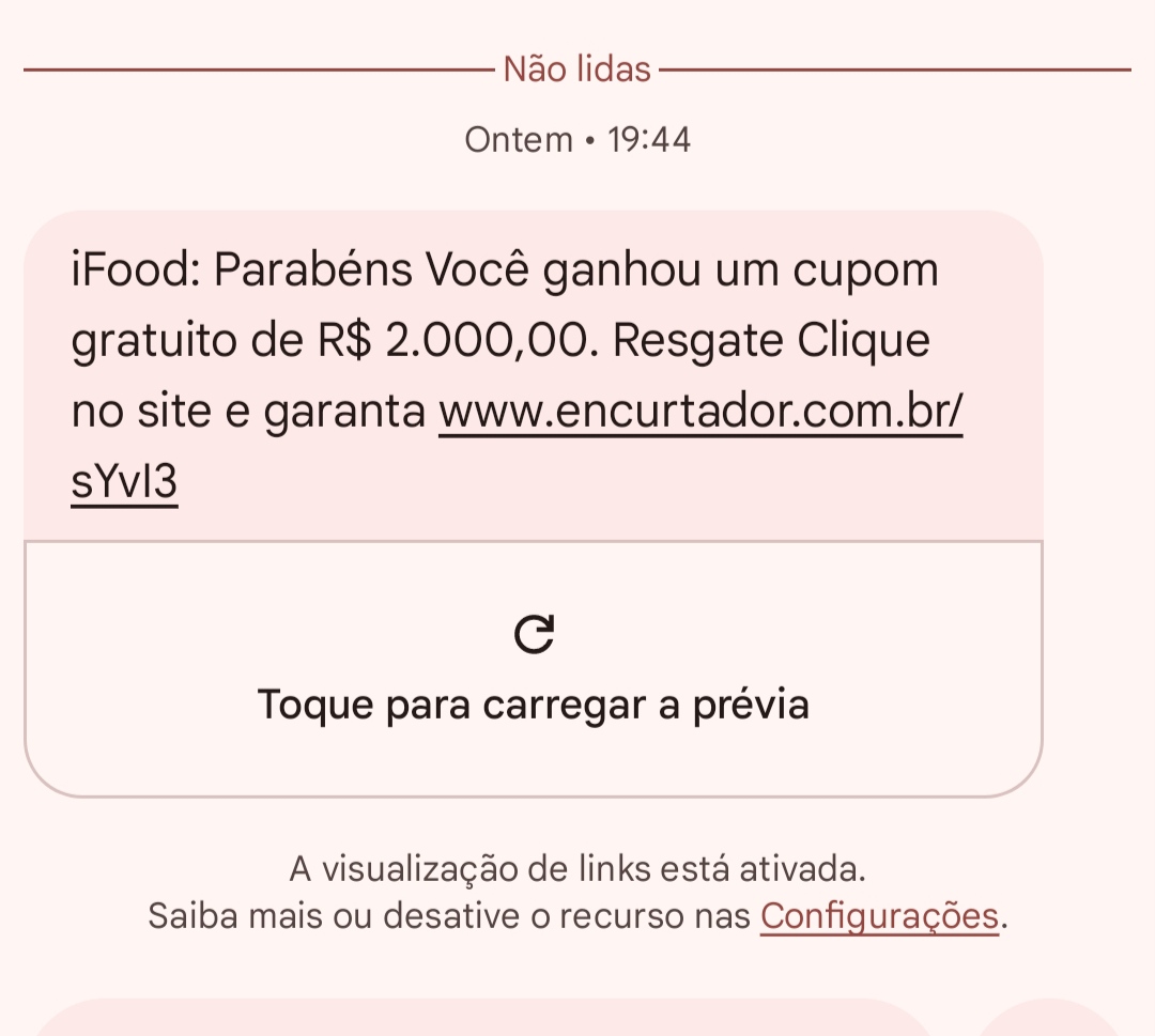 Acabei de receber esse mesmo SMS dizendo ser do Ifood… porém não abri… R$2.000 em cupons? Tem cara de golpe, cheira a golpe e tenho certeza que é golpe… kkk